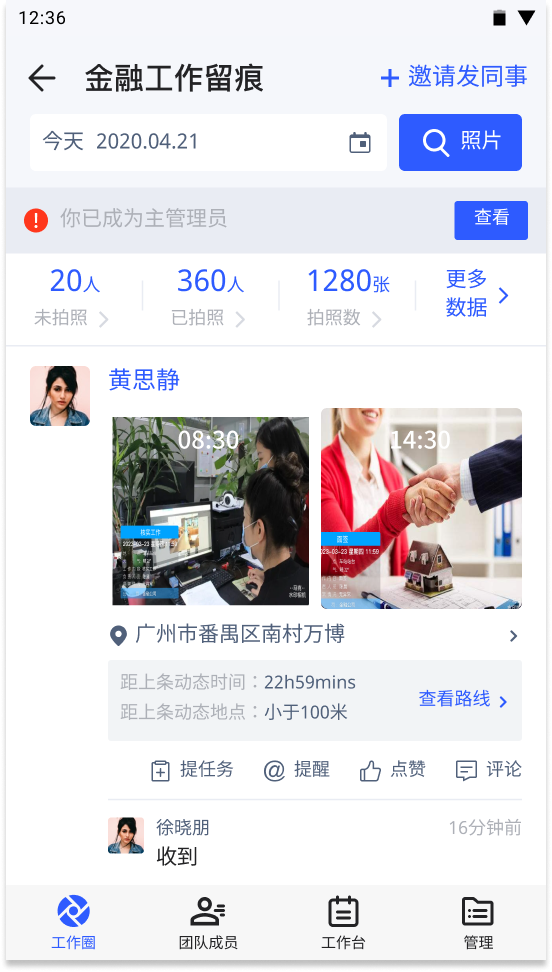 马克水印相机拍摄的照片可以自动同步团队,并且水印照片自动同步团队后,很好的解决照片甩微信群,很乱不容易查找的痛点。只需要翻看团队的照片即可了解当日的工作情况,并且团队内还可以进行任务的指派,使得整个工作环境形成闭环,每件事情都能轻松跟进。在传统团队管理中,人员时常要拍照报备自己的工作情况,但是人数太多照片容易丢失或查找不便,工作汇报成为员工负担,对此,马克水印相机的团队工作圈可以有效解决这类工作汇报问题。