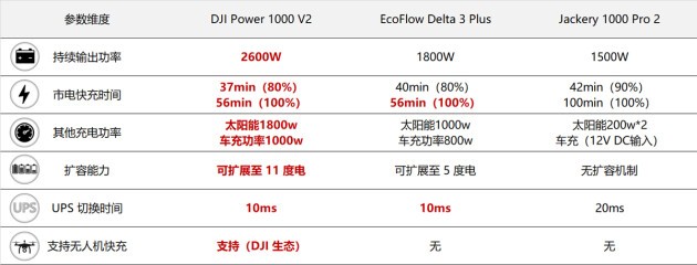 在市场上,消费者面临着多款户外电源的选择,除了基础的电池容量,更高的输出功率,更快的充电速度、更好的扩容与生态等都是决定体验的重要因素。根据公开资料整理DJI Power 1000 V2与正浩EcoFlow Delta 3 Plus和电小二 Jackery 1000 Pro 2的核心参数对比。